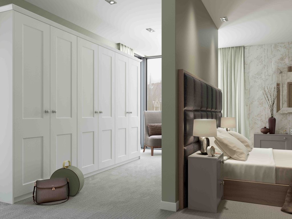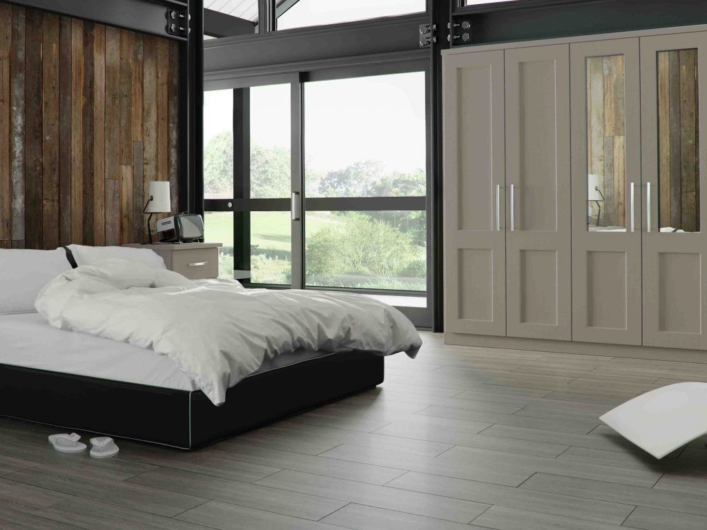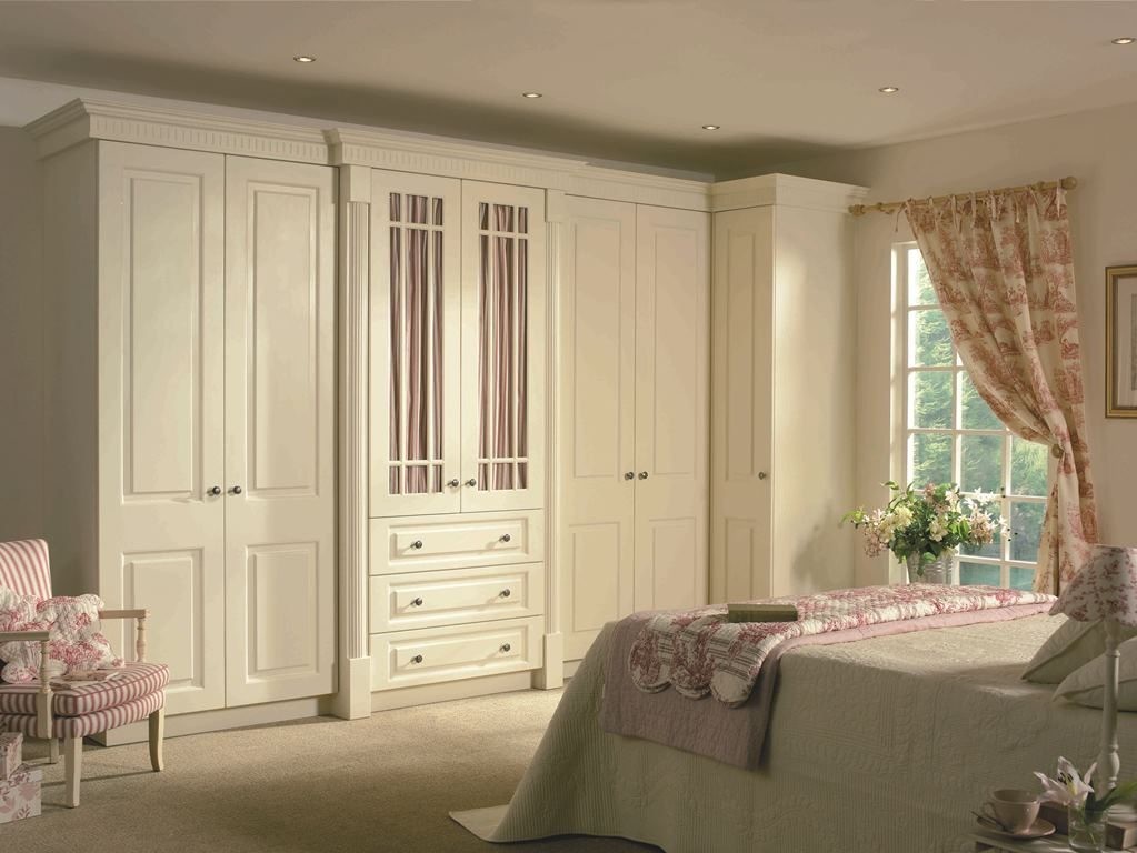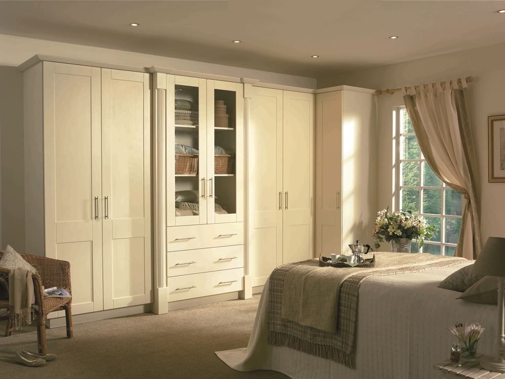 Natural décor and accessories work perfectly with this simple yet elegant shaker design. The reeded pilasters and glass doors add interest to the mid section. The end result is a very calm, understated bedroom with broad appeal.