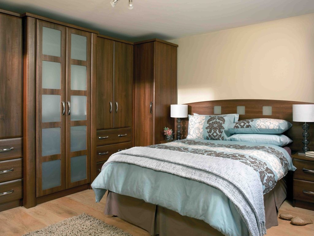 The Dark Walnut effect Slab doors create a rich expensive feel to this bedroom. The square design in the headboard is mirrored in the centre doors giving a clever designer touch. Dramatic bed linen in tones of chocolate and duck egg completes the look.